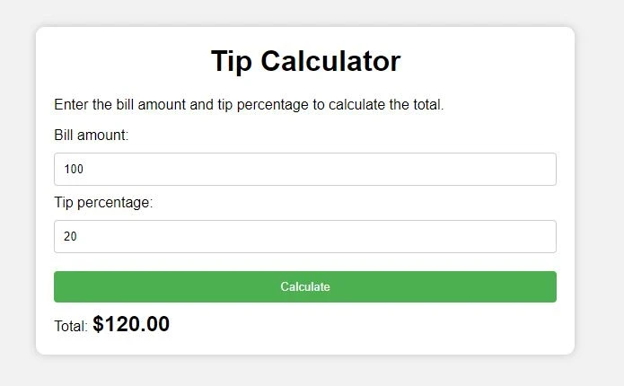 Project Description In this project, our aim is to build a modern tip calculator. The project’s primary interface comprises a container labeled “Tip Calculator” with two input fields: one for